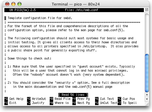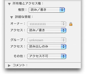 | 前述のWindows側から保存したファイルの情報を、サーバ側のMacで見てみると右図のようなアクセス権になっている。勿論、ここで設定してそのまま保存すればアクセス権を変更できる訳だが、多数のクライアントから作成されるファイルを片っ端から追いかけてまわる訳にはいかないのである。 この項ではターミナルで動作するテキストエディタ「pico」を使うので、その練習にもなるのではないかと思う。 それでは、Sambaの設定ファイルである "smb.conf"をターミナルで変更していこう。 |